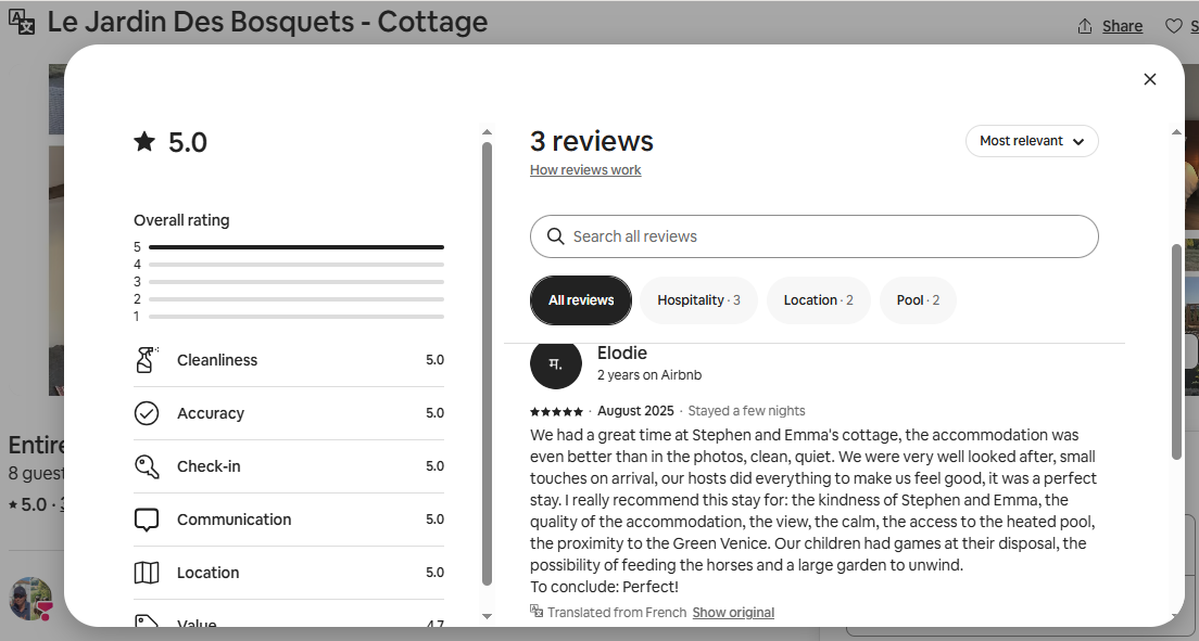 We only opened our gite for business at the end of July 2025 and were thrilled to get some wonderful reviews on both Booking.com and AirBnb!!