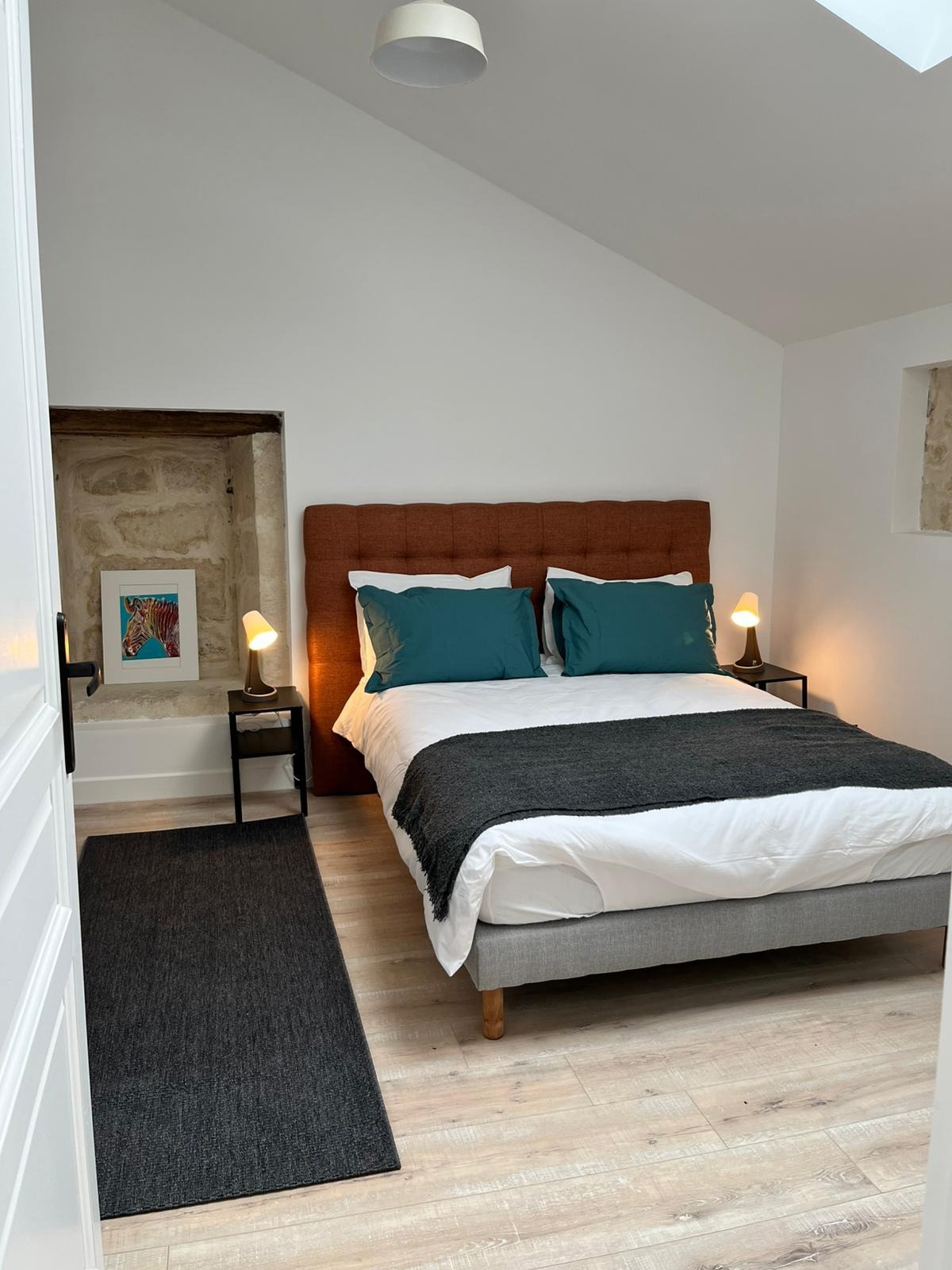 Le Jardin des Bosquets’ gîte has been lovingly transformed from a section of our historic stone barn, dating back to the 1700s. The renovation preserves elements of the barn’s original character and rustic charm, seamlessly combined with modern comforts and a sleek, industrial-inspired décor. The result is a unique and inviting space, perfect for our guests.